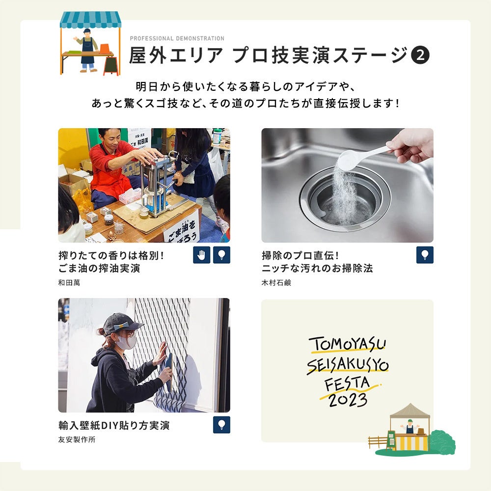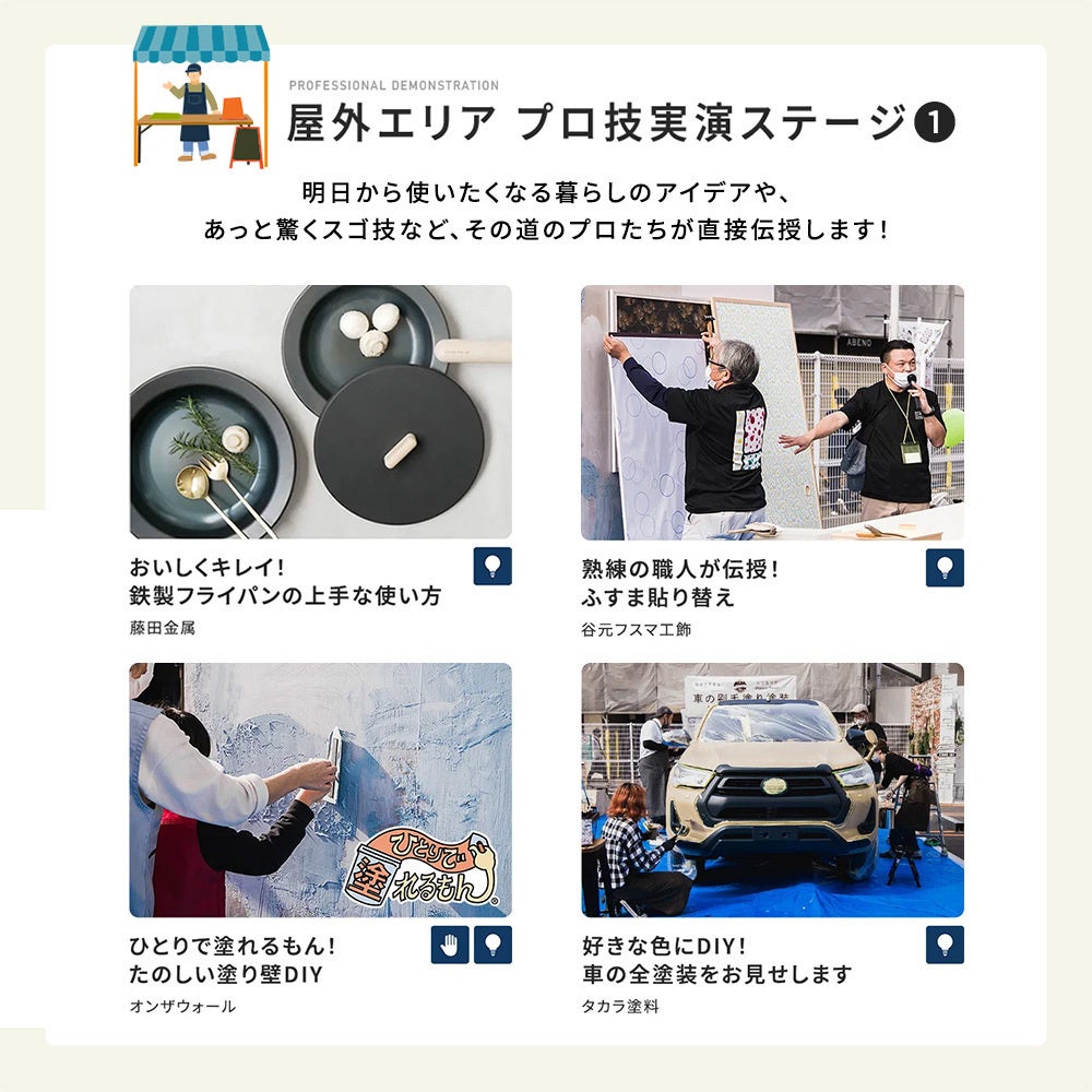壁紙の貼り方実演をはじめ、ふすまの貼り替え、塗り壁DIY施工、ニッチな汚れ掃除、鉄製フライパンの上手な使い方、ごま油の搾油、車の刷毛塗り塗装など、その道のプロたちが実演。くらしを彩るアイデアやポイントがわかるかも!(観覧無料)