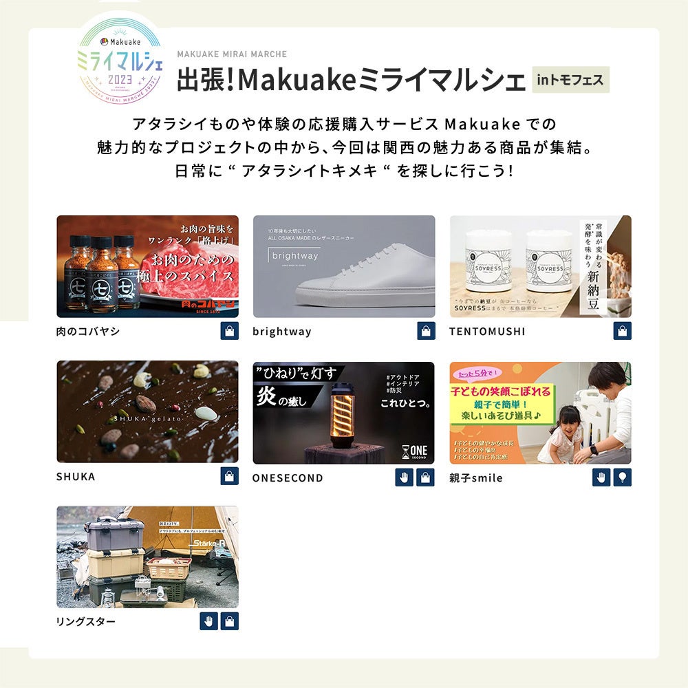 アタラシイものや体験の応援購入サービス「Makuake」でのプロジェクトの中から、関西の魅力ある商品が集結。実際に購入できます。