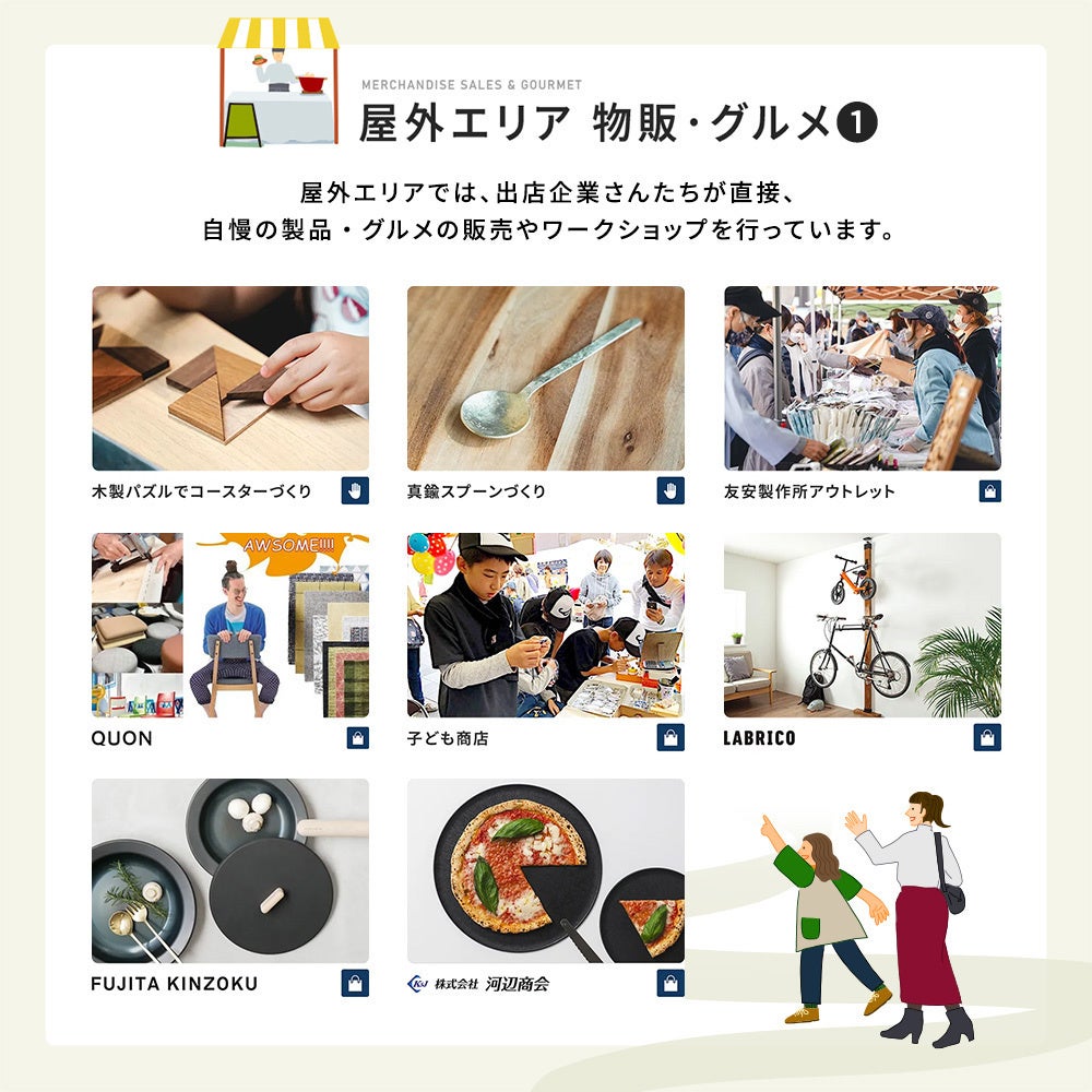 出展者:QUON(オーツー)/河辺商会/木村石鹸/子ども商店(たくらみや)/谷元フスマ工飾/FAT CAMP/不易糊工業/藤田金属/ブリューパブテタールヴァレ/ラピス/ラブリコ(平安伸銅工業)/和田萬/友安製作所