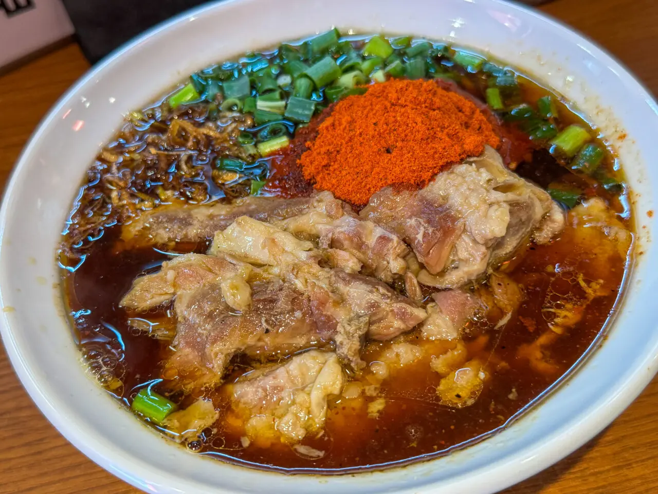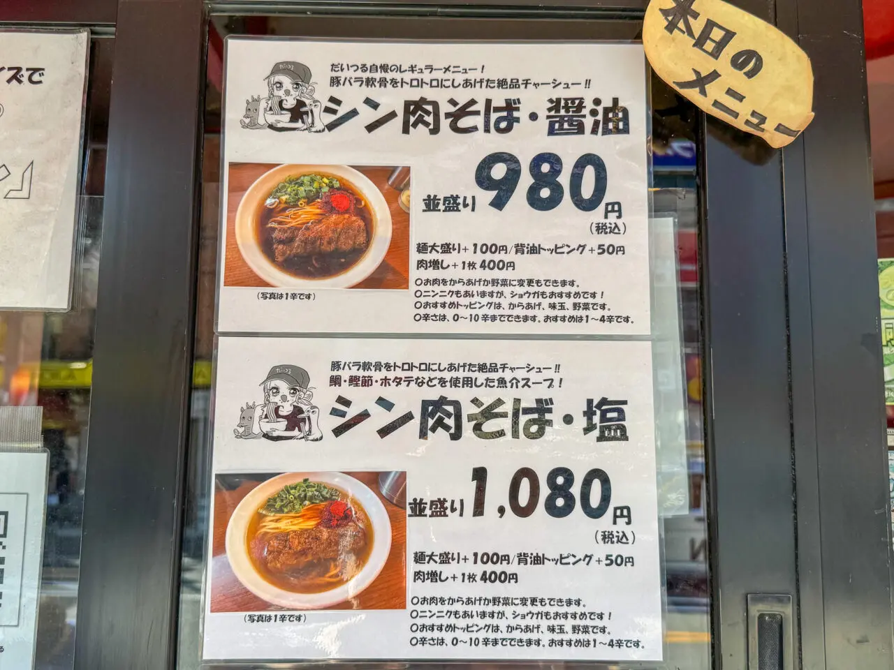 今回は「シン肉そば・醤油」の4辛をいただきました。シン・肉そばといえば、トロトロに煮込まれた豚バラ軟骨!存分に堪能したくて、肉増しをオーダーしました。