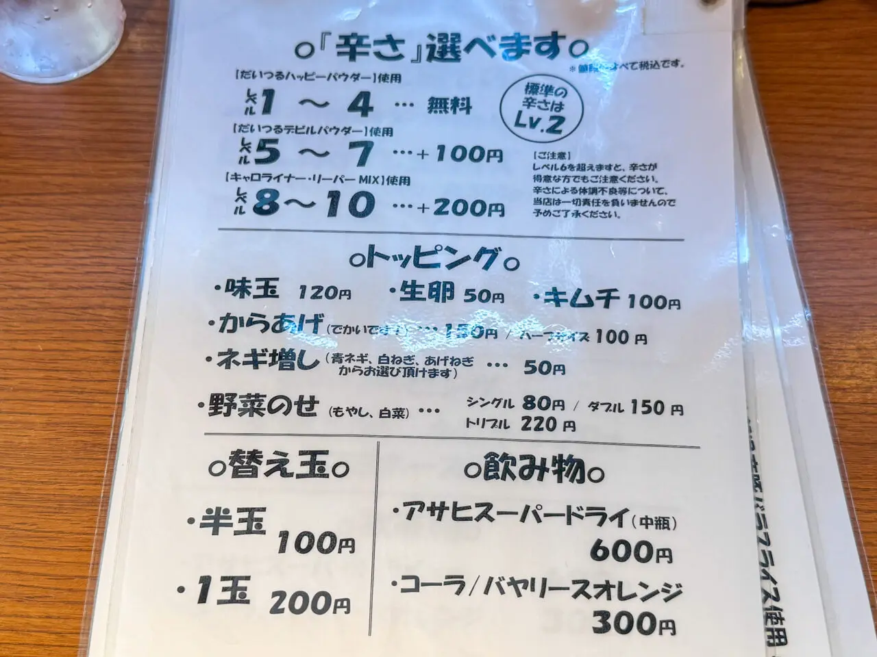 辛さを選ぶことができ、卓上にはしょうが、にんにく、さんしょう、こしょうが用意されているので自分好みにカスタマイズが可能です。