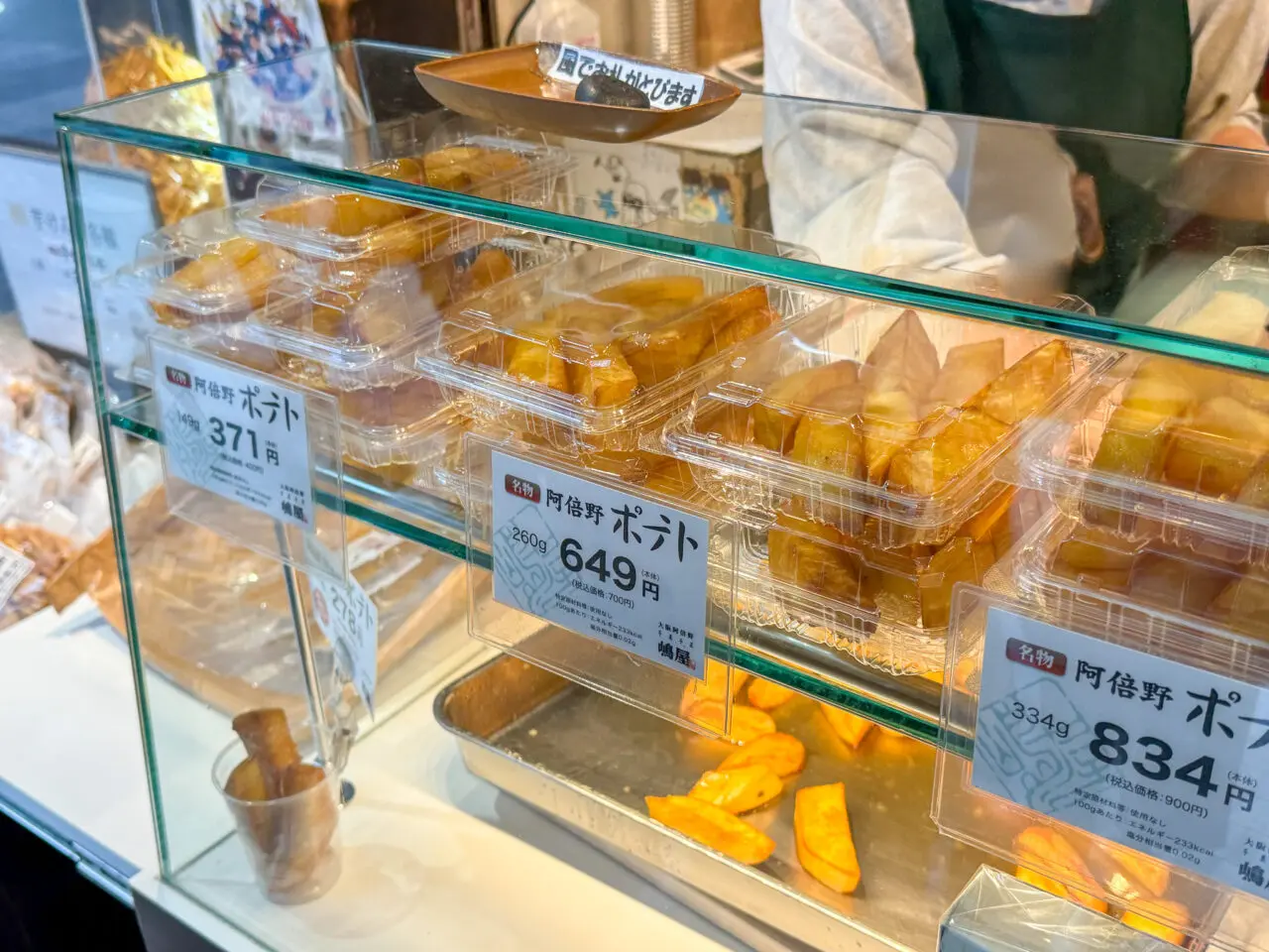 よくある大学いもと違い、阿倍野ポテトは水あめを使用せず、特製の氷砂糖で作った蜜に油で揚げた後数分間漬け込んでいるのだそう。特製の蜜は上品な甘さで、何個でも食べられそうです。