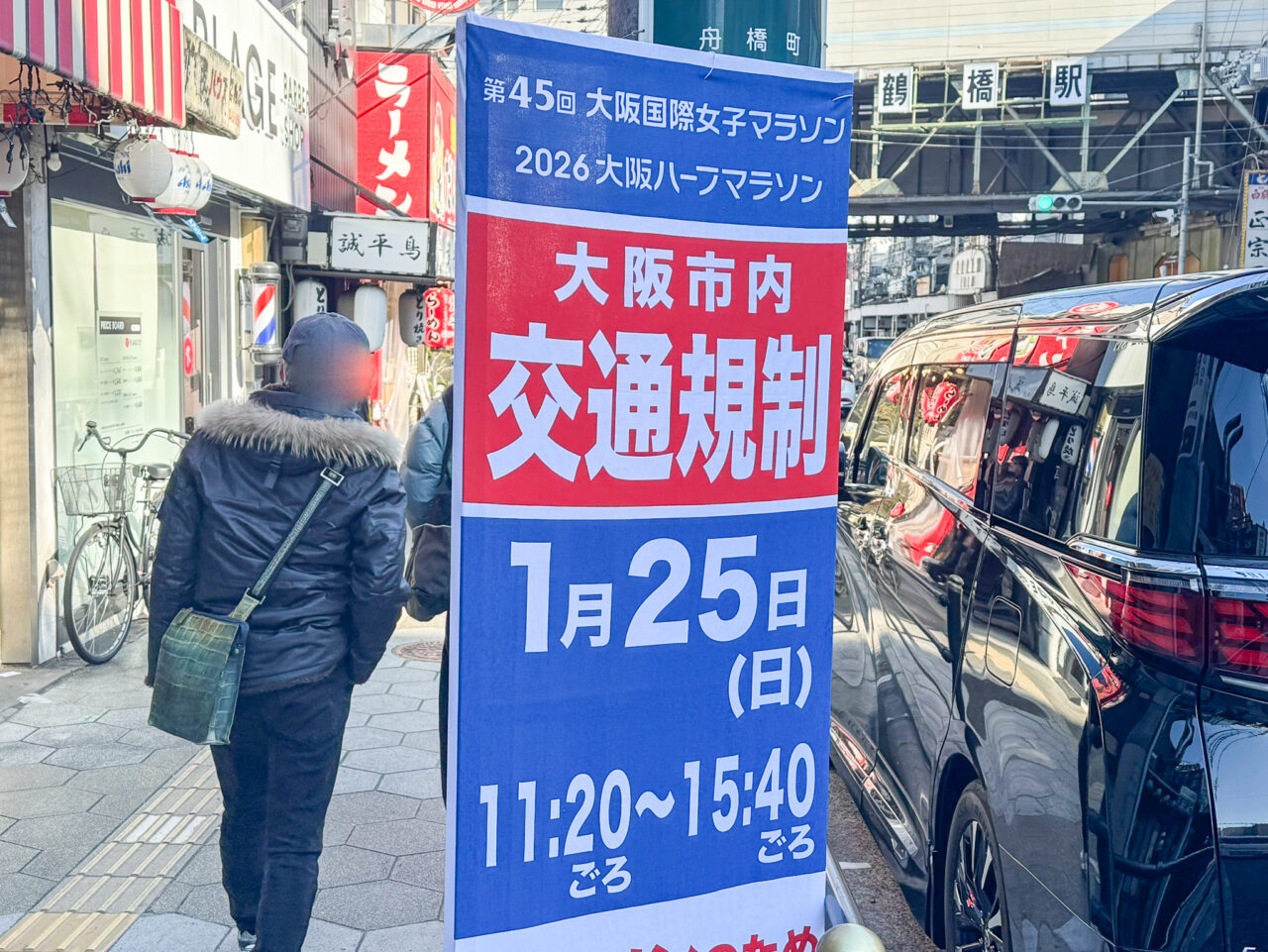 大阪国際女子マラソン・大阪ハーフマラソンともに、天王寺区は玉造筋がマラソンコースとなっています。公式の情報によりますと、玉造筋の通行止・駐停車禁止時間は11:30ごろ~14:50ごろ。鶴橋駅近くには、11:20ごろ~15:40ごろと書かれていました。