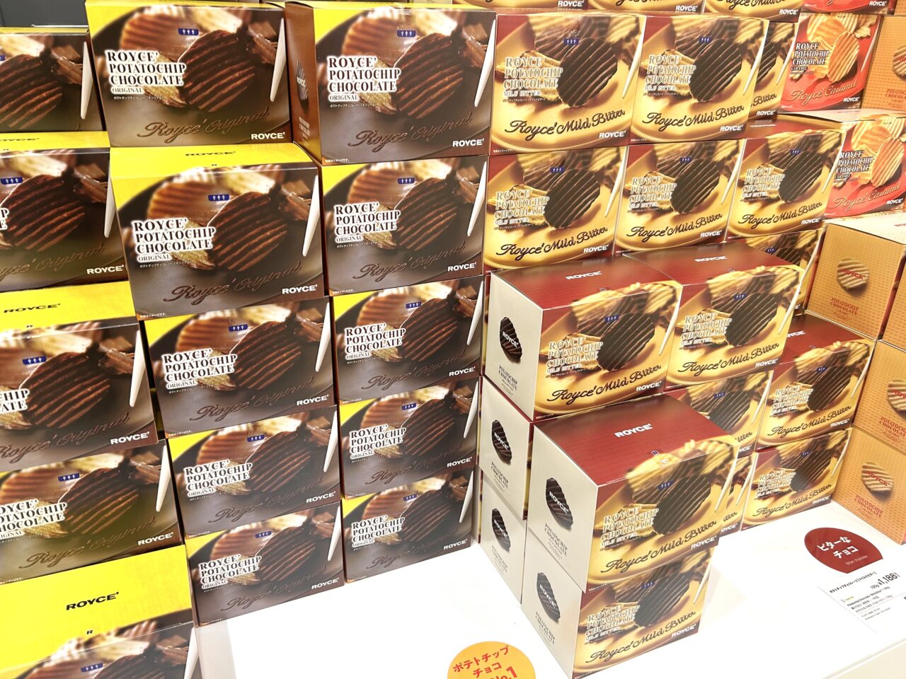 また、ポテトチップとチョコレートという意外な組み合わせから生まれた大ヒット商品のポテトチップチョコレート「オリジナル」(1箱1,188円)も並び、パリッとした軽快な食感と、コーティングされた口どけの良いチョコレートが織りなす甘さと塩味の絶妙なバランスを楽しむことができます。