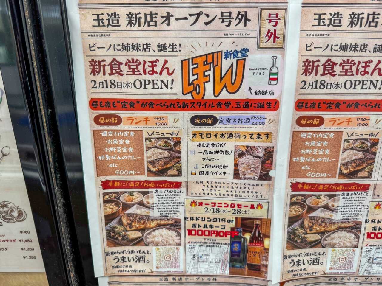 【大阪市天王寺区】「生ハム&イタリアン vino」の姉妹店!玉造駅近くに昼も夜も定食が楽しめる「新食堂ぼん」が2026年2月18日にオープンしています!