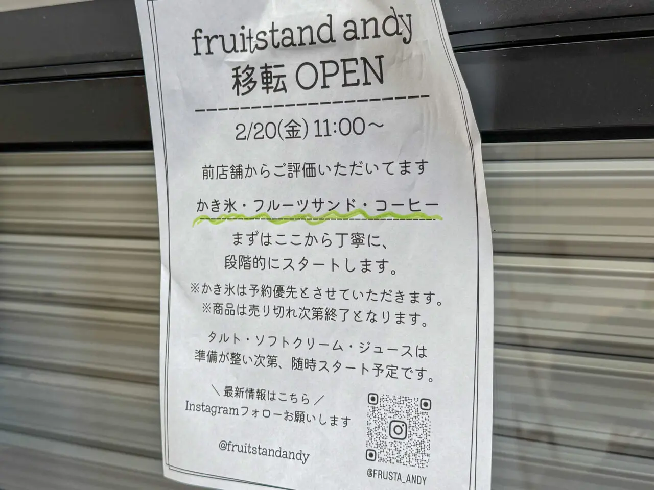 【大阪市天王寺区】旬の果実を楽しむかき氷やフルーツサンドが人気!「fruit stand andy」が玉造日之出通北商店街に2026年2月20日移転オープン!