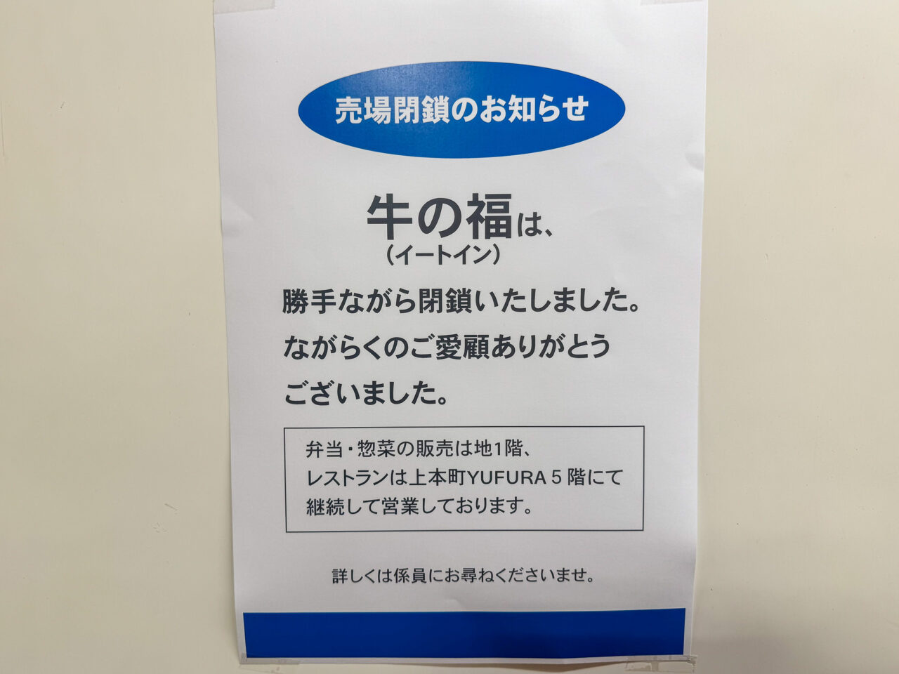 こちらにあった「牛の福」は閉鎖しており、地下1階で弁当・惣菜の販売を、上本町YUFURAの5階でレストランを営業しています。