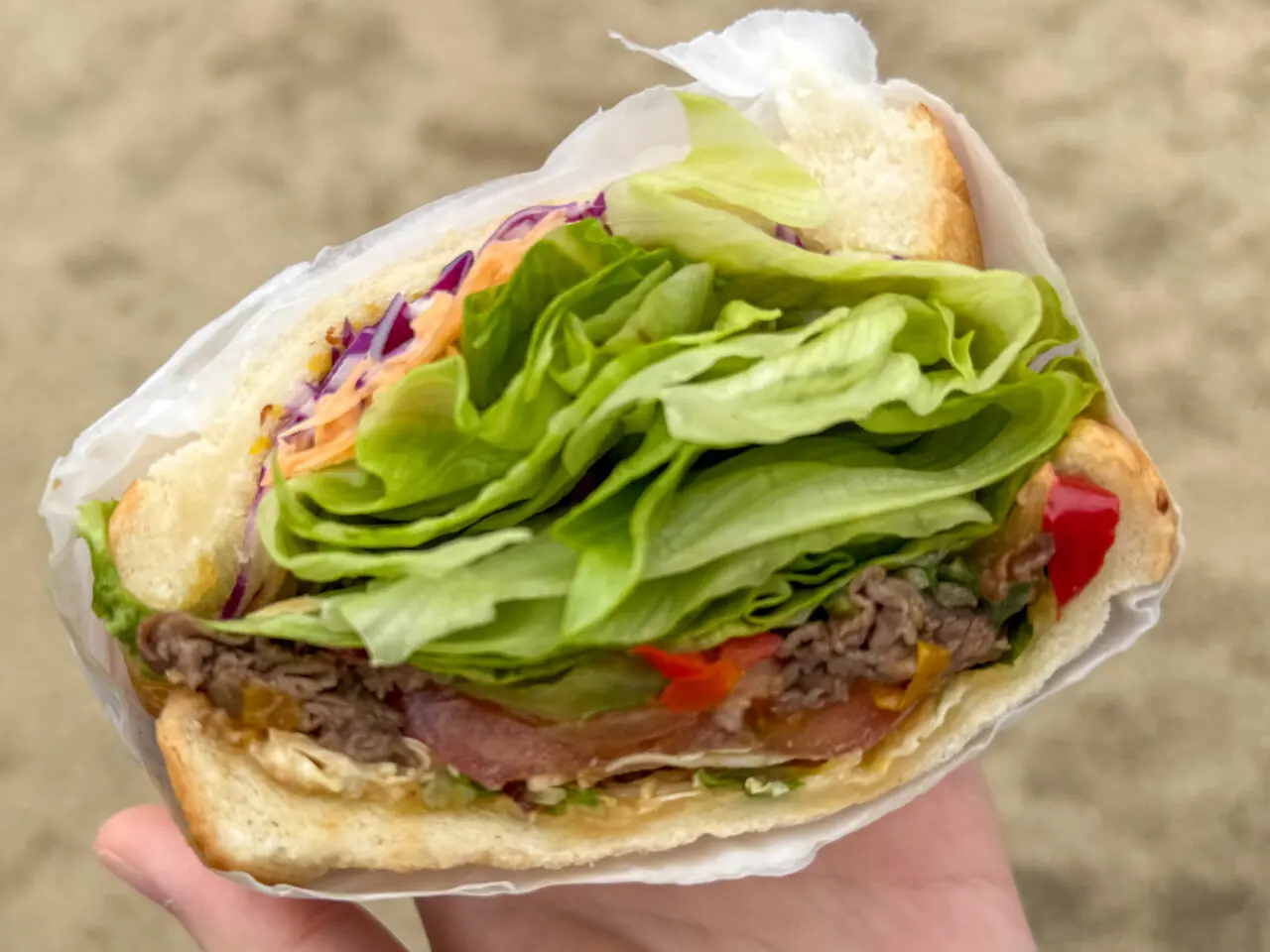 溢れんばかりのシャキシャキ野菜と、絶妙な甘辛い味付けのお肉とのバランスが最高!食べやすく半分にカットされているので、家族や友人とシェアして食べるのも楽しみが広がりますね。